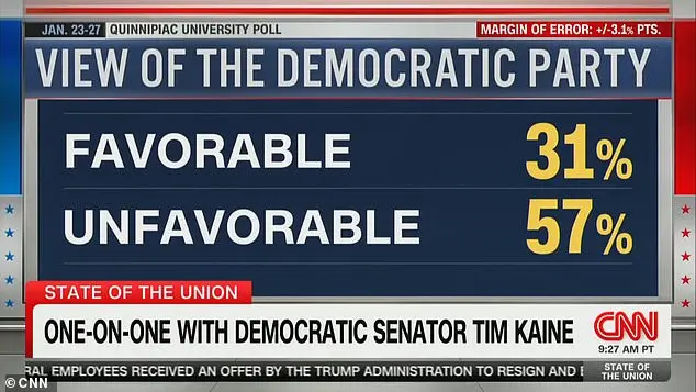 On Sunday, Jake Tapper left Democrat Senator Tim Kaine speechless when questioned about a recent Quinnipiac poll showing the national party’s widespread unpopularity. The CNN host presented the poll results, which revealed that only 31% of Americans held a favorable view of the Democratic Party, compared to 57% who viewed it unfavorably. Tapper then inquired, ‘Why is your party so staggeringly unpopular with the public?’ Kaine, a former vice presidential candidate, responded by deflecting the question and focusing on the shift in Virginia’s political landscape. He claimed that the Democratic success in Virginia was due to the party’s focus on the economy and innovation. However, he failed to provide a direct answer to Tapper’s question about the national party’s reputation.
