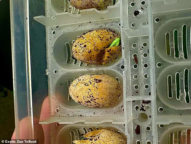 The eight hatchlings, described as ‘striking’ with vibrant lime green and jet black stripes, are currently being raised under carefully controlled conditions that mimic their tropical habitat.