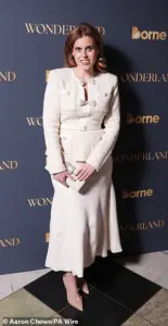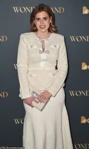 In an elegant display at tonight’s gala, Beatrice was photographed arm-in-arm with her husband Edoardo. Dressed in a sophisticated all-cream ensemble including a chic silk skirt and long-sleeved blazer featuring button and bow detailing, she showcased the refined style synonymous with the royal family. Her hair styled in soft curls and face adorned with glamorous makeup completed the look.