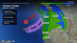 A powerful storm is moving into the Northwest region of the United States, bringing with it heavy rain and damaging winds that will affect five states starting Monday morning. This latest system follows closely on the heels of a weekend storm, which was intensified by an atmospheric river, dumping two to four inches of rain in coastal areas of Washington and Oregon and triggering flash floods across both states.