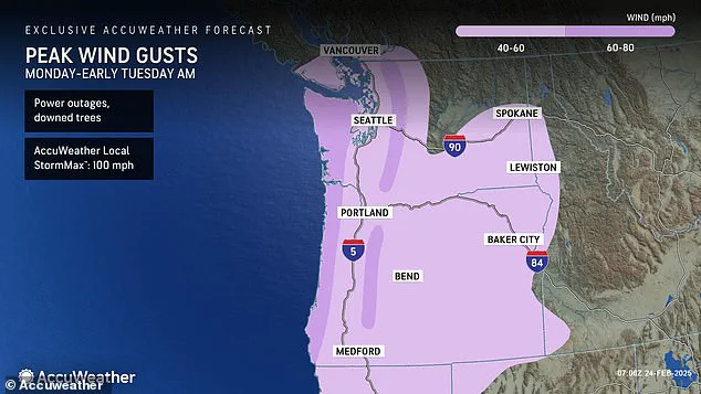 The region most at risk for downed trees and power outages through Tuesday morning is along the border between Washington and Oregon, potentially seeing winds reach 100 mph. AccuWeather reported that these areas will be particularly vulnerable to storm-related disruptions.