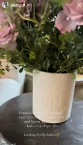 The centerpiece of the arrangement was a white stone vase, featuring the logo of Meghan’s lifestyle brand, As Ever.