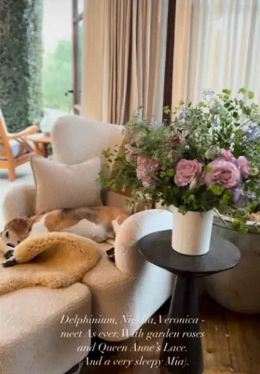 In a recent Instagram post, Meghan shared a glimpse of her Montecito home, showcasing a serene scene featuring her beagle, Mia, lounging on a cream armchair alongside an elegant floral arrangement.