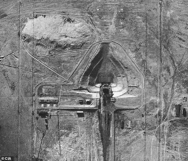 The agency declassified a more than 400-page report that detailed how testing its secret spy planes ‘accounted for more than one-half of all UFO reports during the late 1950s and most of the 1960s.’ Pictured is a mysterious triangle tower on the base