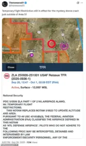 A temporary flight restriction was issued by the FAA shortly after the US Air Force announced the crash of a military aircraft near Area 51