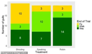The results were striking: gulls exposed to the shouted version of the phrase spent significantly less time near the chip-filled containers compared to those hearing the calm version.