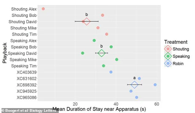 Once a bird got within range, they played one of three audio clips: a recording of a man shouting, ‘No, stay away, that’s my food’; the same voice speaking the same words in a calm tone; or a neutral birdsong from a robin.