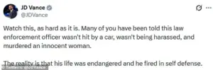 Vance has taken a firm stance in defense of Ross, labeling the media’s portrayal of the incident as ‘disgusting’ and ‘shameless press propaganda.’ He has called for unity in supporting law enforcement, stating, ‘To the radicals assaulting them, doxxing them, and threatening them: congratulations, we’re going to work even harder to enforce the law.’ His comments align with the Trump administration’s broader narrative that Ross acted in self-defense, a position that has drawn sharp criticism from Democrats, who have branded the officer a ‘murderer.’