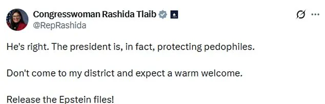 The president is, in fact, protecting pedophiles,’ Tlaib said, referencing the Jeffrey Epstein saga.