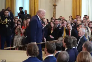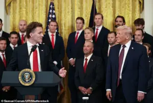 Speaking before a crowd of players, fans, and dignitaries, Trump lauded the Panthers for their ‘incredible playoff run’ and their ‘good looks,’ a remark that drew laughter from the audience. ‘Good-looking people, young beautiful people, I hate them,’ he quipped, joking about the players’ ability to steal the spotlight.