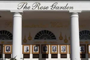The walkway, which faces the Rose Garden, displays gold-framed portraits of past presidents alongside plaques detailing their achievements or misdeeds.