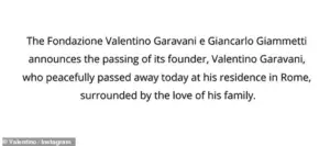 The news was confirmed by his foundation, which took to Instagram to announce the tragic loss, marking the end of an era for one of the most influential figures in haute couture.