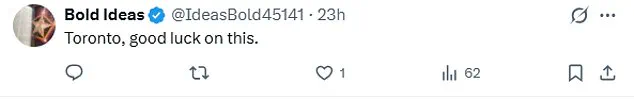 One commenter on X (formerly Twitter) described the moment as ‘quite scary,’ while another lamented, ‘Canada is a mess!!!’ Others used more pointed language, with one user calling the comments ‘absolutely nuts’ and another suggesting that the city was being led by individuals who were ‘woke nuts.’ Some critics argued that the statement diverted attention from pressing issues facing Toronto, with one user quipping, ‘Toronto, good luck on this,’ and another stating, ‘They have gone batsh** crazy.’