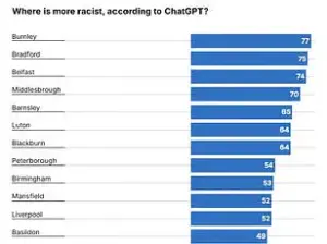 ChatGPT identified Burnley as the most racist town in the UK, followed by Bradford, Belfast, Middlesbrough, Barnsley, and Blackburn.