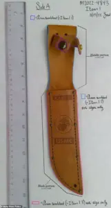 Several images show the 13-inch tan leather sheath lying amid blood-soaked bedsheets in Mogen’s bedroom.