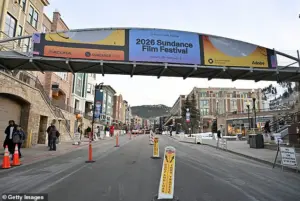 A bridge crossing over Main Street is seen with signage for the 2026 Sundance Film Festival on January 22, 2026 in Park City, Utah, where the alleged assault took place
