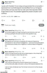In a social media post, he acknowledged the conversation with Trump, highlighting the contributions of Minneapolis’s immigrant communities and reiterating his demand that ‘Operation Metro Surge’ be terminated.