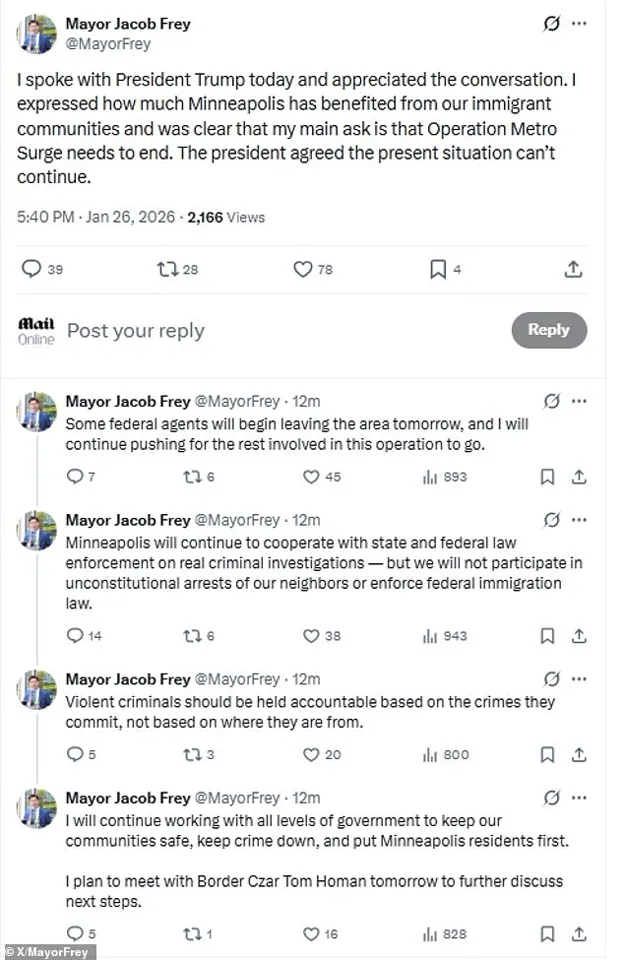 Trump emphasized collaboration between Frey and Border Czar Tom Homan, stating that ‘lots of progress is being made’ and that Homan would meet with the mayor the following day to ‘continue the discussion.’ This marks a departure from the administration’s earlier confrontational stance, which had been characterized by tensions over ICE raids and protests erupting after the deaths of Renee Good and Alex Pretti.
