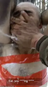 The commander, captured in the footage, was heard shouting, ‘[They] wanted to **** off from their positions, not follow orders.’ As he forced snow into the mouth of one of the soldiers, he added, ‘Eat, you ****ing *****.’ The terrified soldier, pleading in desperation, said, ‘I’m sorry, it won’t happen again.’ His commander responded with a chilling remark: ‘You need to work, not **** off.