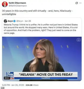 As the political landscape continues to shift, the controversy over Melania Trump’s documentary and Olbermann’s comments serves as a stark reminder of the deepening polarization in the nation.