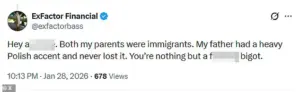 Both my parents were immigrants,’ one commenter wrote, adding, ‘My father had a heavy Polish accent and never lost it.’ Others echoed similar sentiments, with one user accusing Olbermann of being ‘nothing but a f***ing bigot’ for his incendiary post.