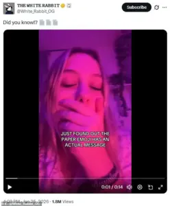 The discovery was first brought to light by X user @White_Rabbit_OG, who shared a video zooming in on the paper emoji and revealing the hidden text.