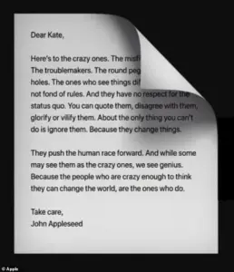 Take care, John Appleseed,’ is a direct nod to Apple’s iconic 1997–2002 ‘Think Different’ advertising campaign.