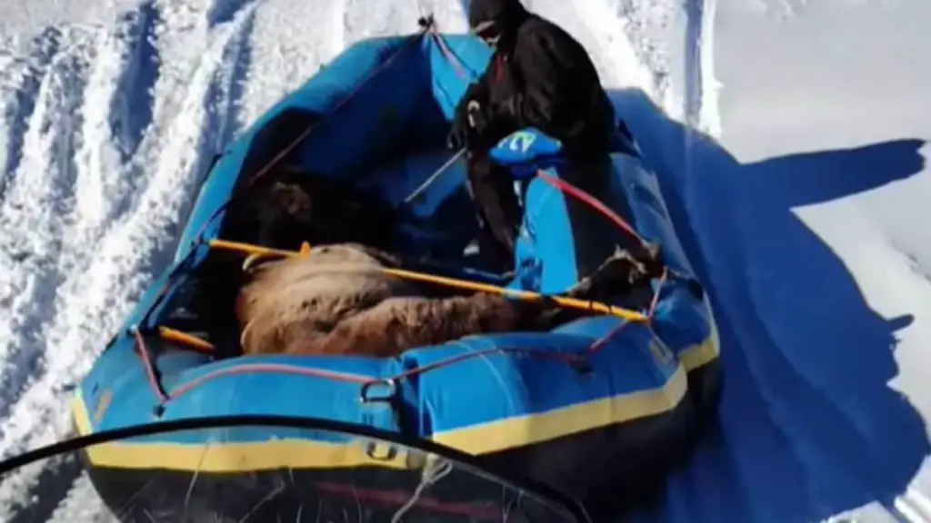 Ten miles from the nearest road, Campbell spotted Mouse standing alone on a wooded ridge, facing him. ‘Lo and behold, there’s Mouse standing right there,’ Campbell said. ‘He’s looking right at me. I was like, holy cow – by God, he’s alive.’ The team used the snowcat to tow the raft about 4,000 yards through deep snow to a waiting snowcat, which carried Mouse, a pack horse, back to Dubois, with cowboys following on snowmobiles.
