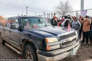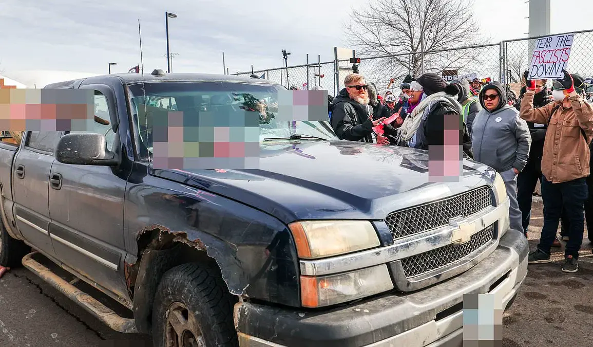 The scene was a stark contrast to the solemnity of the day’s purpose. Protesters had come to honor Renee Good and Alex Pretti, two activists killed in separate encounters with ICE agents. Good had died on January 7, and Pretti on January 24. Yet, instead of unity, the crowd descended into chaos. A man driving a dark blue pickup truck, his vehicle bed adorned with a banner reading ‘NUREMBERG 2.0,’ became the unintended target of his fellow demonstrators. The reference to the Nuremberg Trials—a historical reckoning of Nazi war crimes—seemed to underscore a growing sense of desperation among protesters, who saw themselves as standing against another form of injustice.
