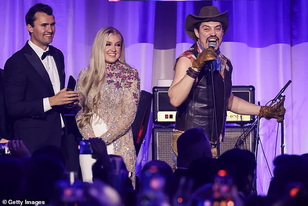 Charlie Kirk and his wife Erika watch as Village People perform on stage during the Turning Point USA Inaugural Eve Ball at the Salamander Hotel on January 19 in Washington, DC.