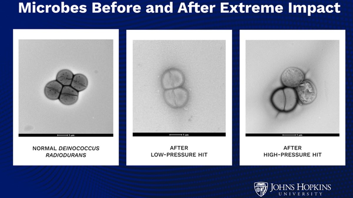 The scientists then put these bacteria through a series of tests designed to simulate an asteroid impact. The bacteria were sandwiched between two metal plates and shot with a heavy projectile moving at 300 miles per hour (482 km/h), producing pressures between one and three gigapascals. For comparison, the pressure at the Mariana Trench, the deepest point in the ocean, is just one tenth of a gigapascal. Despite these incredible forces, the bacteria proved remarkably difficult to kill. At 1.4 gigapascals of pressure, 100 per cent of the bacteria survived with no signs of damage whatsoever. Likewise, 60 per cent of the bacteria survived at 2.4 gigapascals with only some signs of ruptured membranes and internal damage.