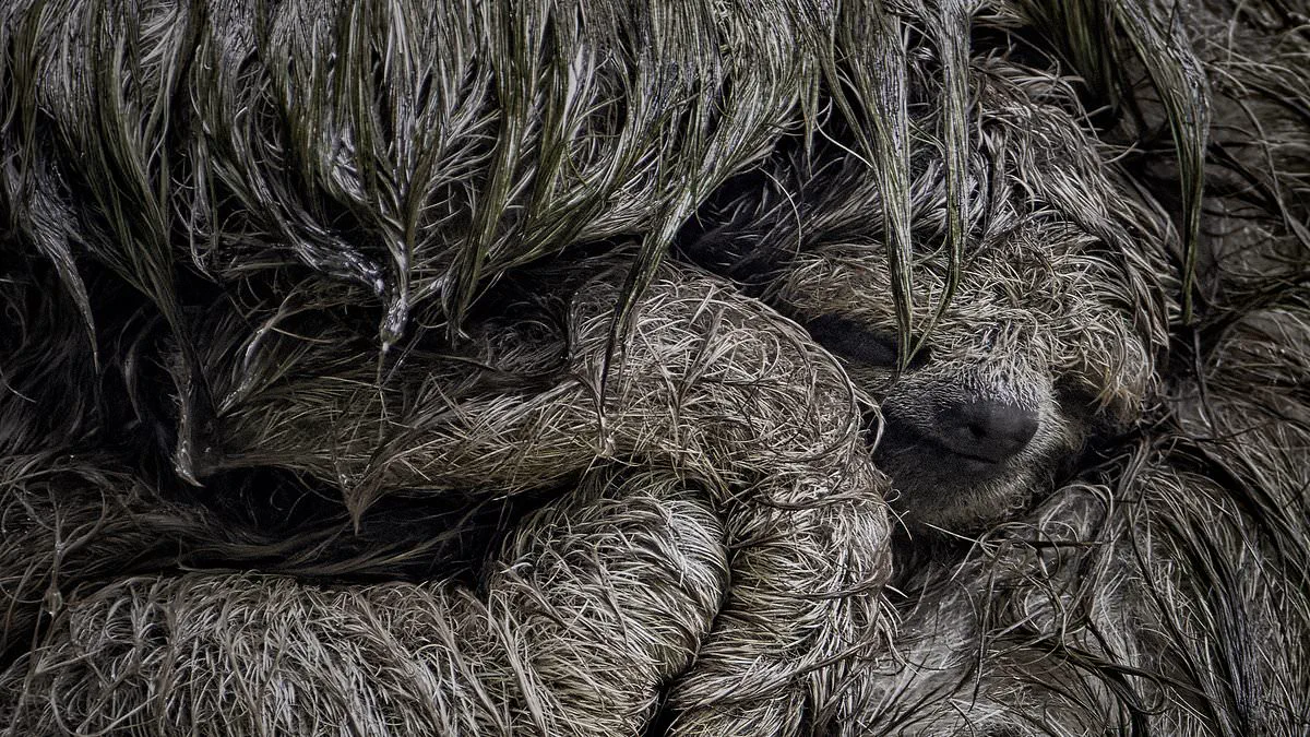 One standout image features a brown-throated three-toed sloth mother cradling her young in her arms, sheltering it from a sudden downpour. The sloth's deliberate movements and the vulnerability of the infant create a poignant moment of maternal protection. Another entry captures a polar bear family resting in the summer heat, their stillness contrasting with the Arctic's relentless cold. The image highlights the animals' adaptation to a changing climate, a theme echoed in other photographs, such as a mountainous pile of confiscated snares in Uganda, a stark reminder of human encroachment on wildlife habitats.
