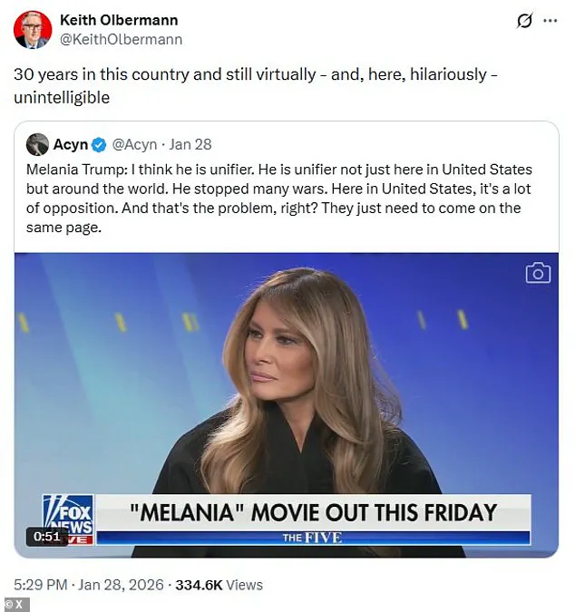 US News Jan 31, 2026 Keith Olbermann Criticizes Melania Trump's English in Response to Her Defense of President Trump as a 'Unifier'
